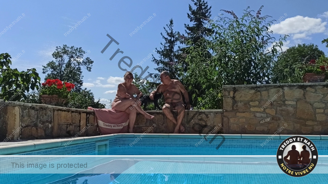 Francine et Bruno (couple à la soixantaine souriante et débonnaire) adoptant le même mode de vie du vivre-nu que nous, et partageant la piscine avec leurs hôtes, il leur était évident que ce gite puisse être réservé à des couples nudistes-naturistes (Pas d’enfants, ni d’animaux de compagnie).