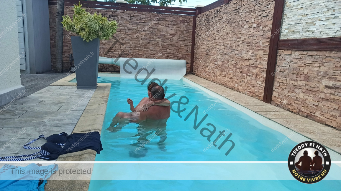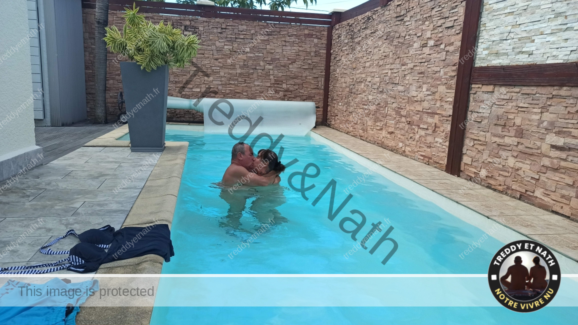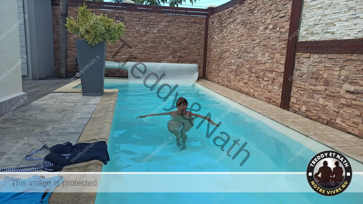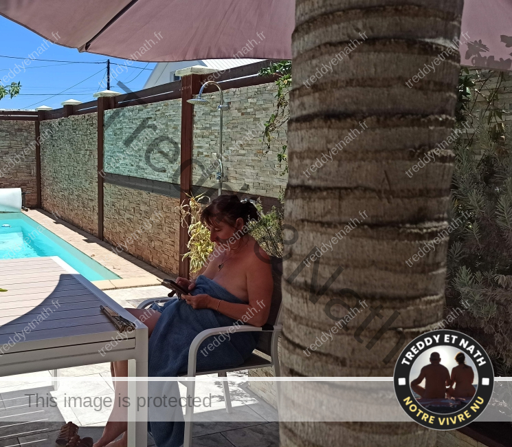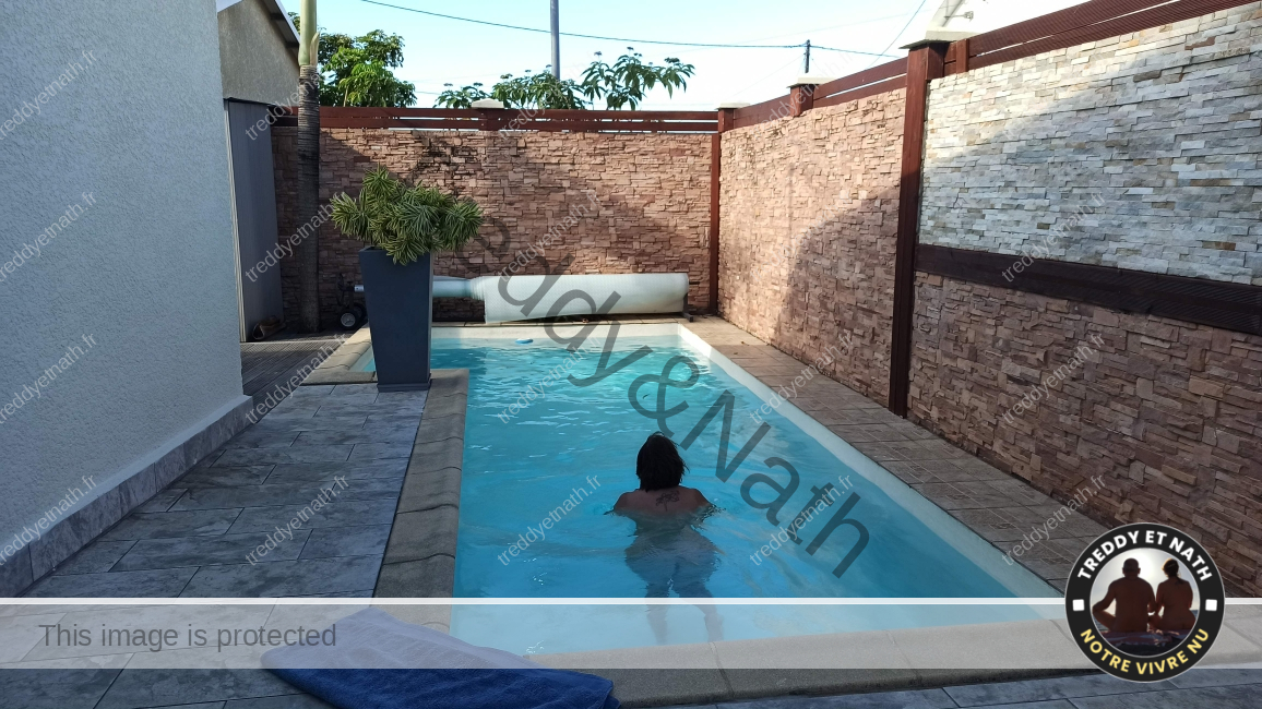 Il dispose d’une petite piscine privée (chauffée à 29 degrés) avec terrasse et sans vis-à -vis ce qui nous permet de pratiquer notre vivre-nu sans soucis.